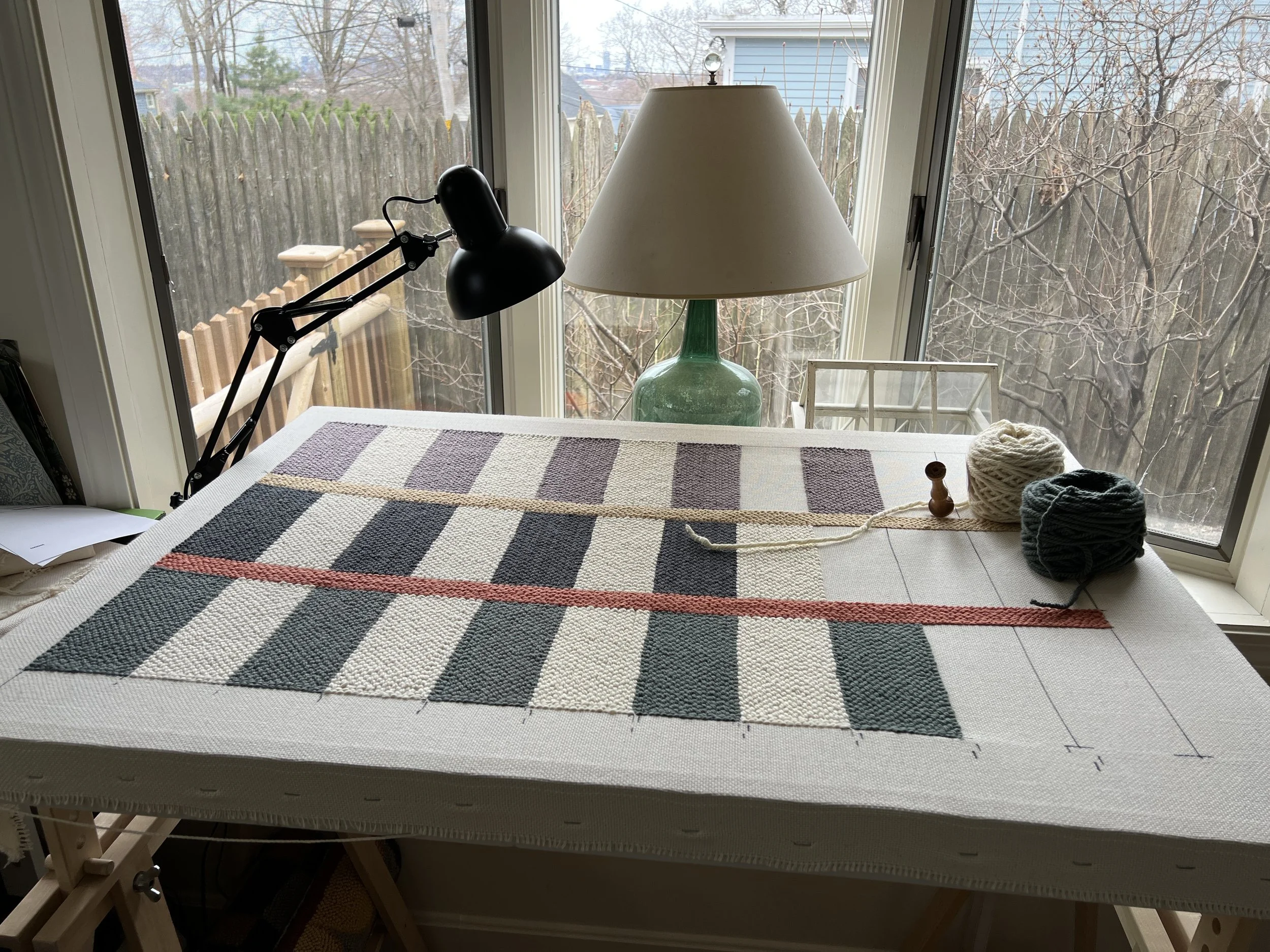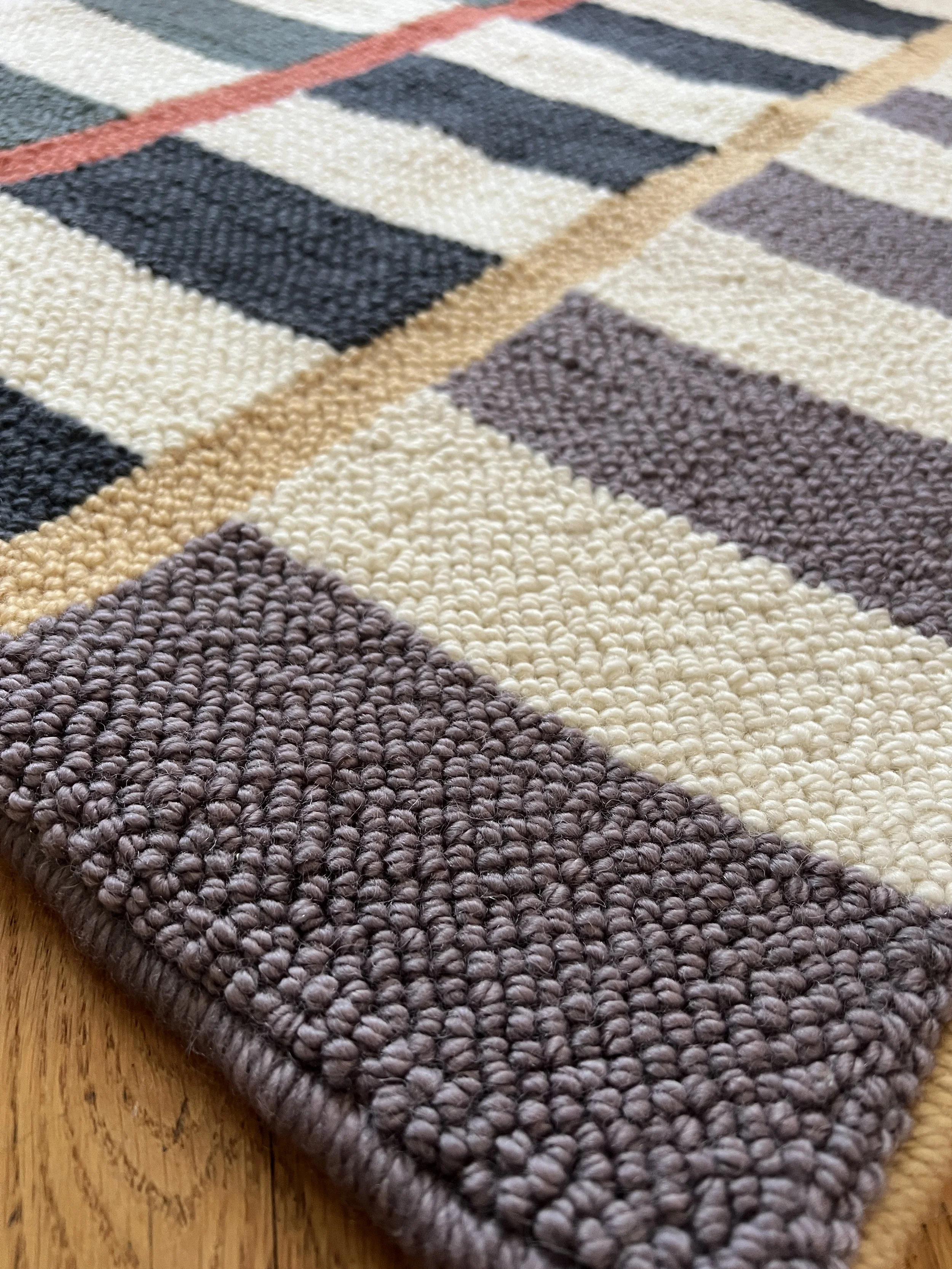 Colorblock Stripes2'x3' 100% wool rug yarn on a cotton backing, 2023A bold, fun, geometric rug in a color palette playing on complementary colors.